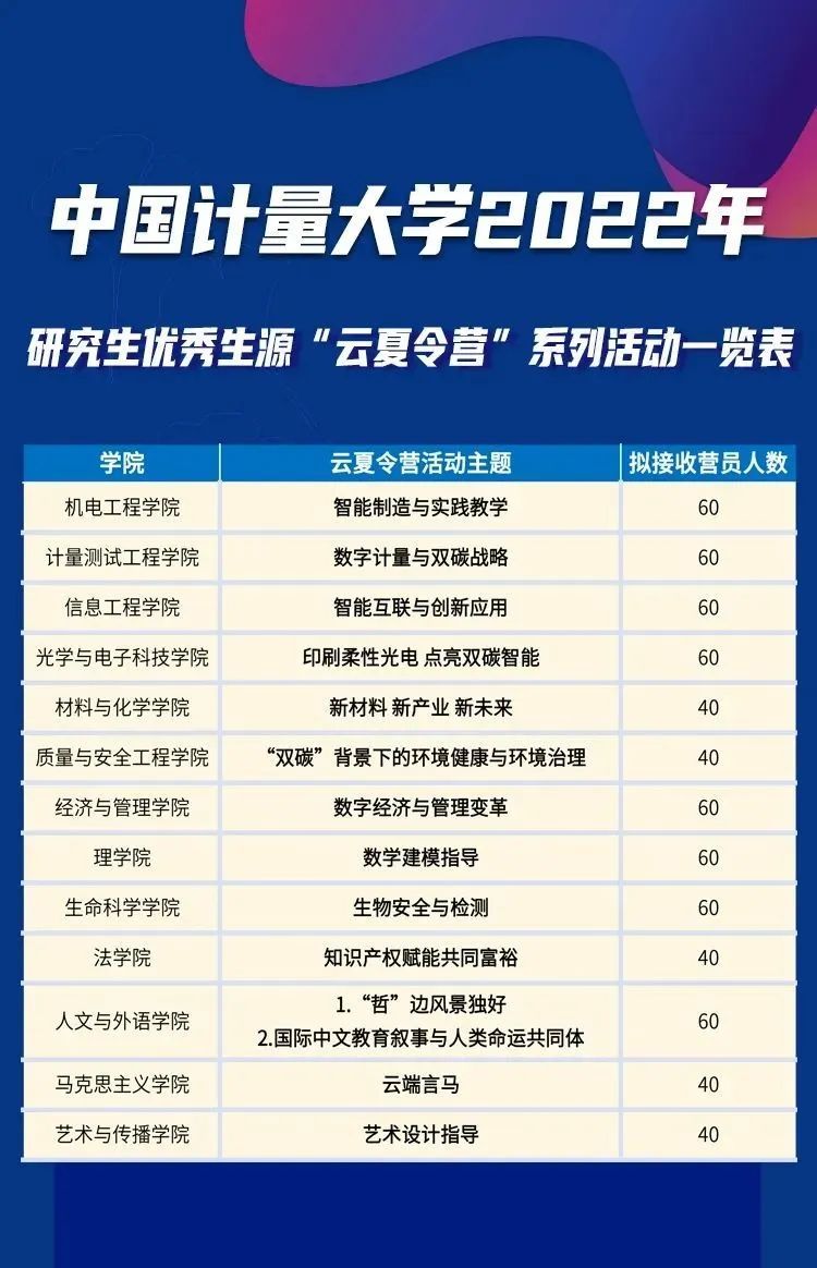为方便全国高等院校的优秀学子了解学校学术、科研环境,促进校内外本科生相互交流,提升实践创新能力,进而吸引优秀生源一志愿报考中国计量大学硕士研究生,我校将于2022年6月底—7月,举办研究生优秀生源线上暑期夏令营(简称云夏令营)系列活动。