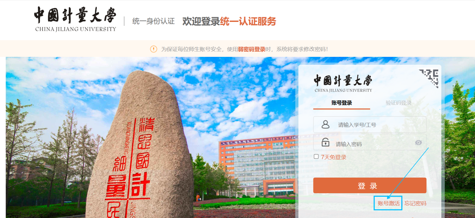 统一身份认证账号(学号)是学生在校使用各种业务系统的唯一账号,如上网认证、“计量钉”、校务网、webvpn(校外访问校内资源)、教学教务选课、图书借阅、一卡通等,必须激活后才能使用。