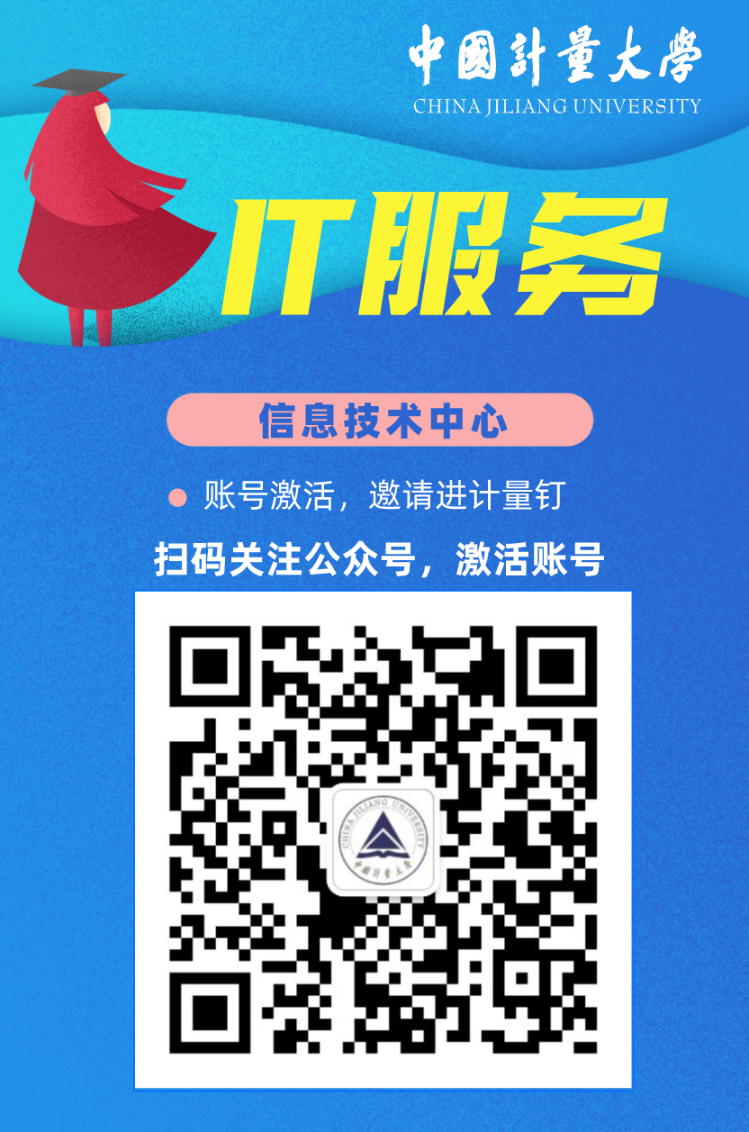 方法一:请如下扫码关注“中国计量大学信息技术中心”微信公众号,点击账号激活,认真阅读激活须知,输入本人学号、身份证号、新生电子注册时绑定的个人手机号,校验通过后即可完成账号激活。